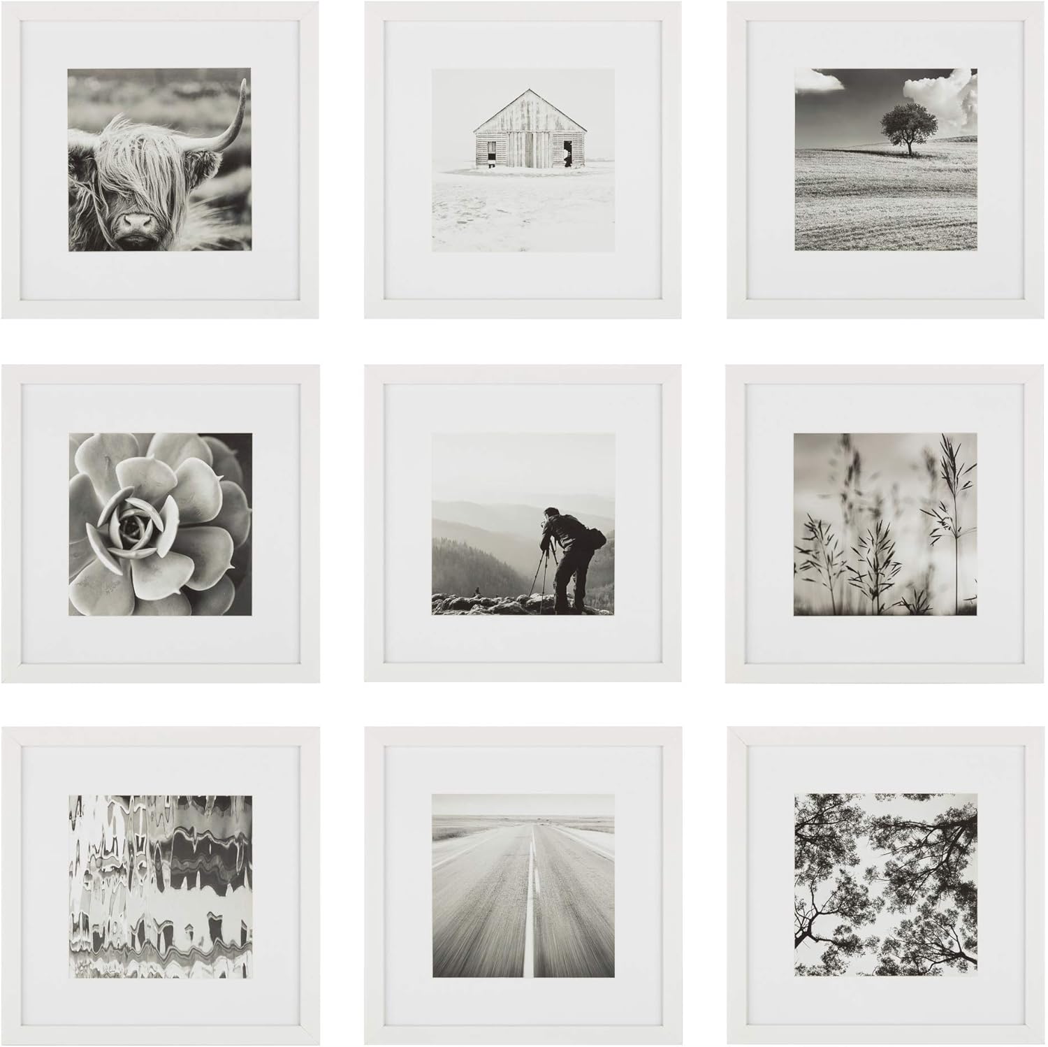 - Gallery wall set includes nine 12" x 12" picture frames with a single white mat for an 8" x 8" image which may be removed if desired