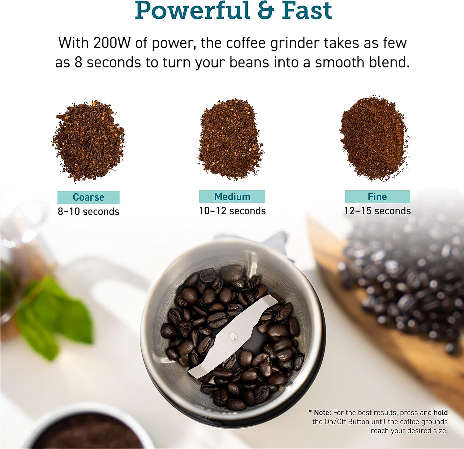 - Quick & Powerful: The stainless steel blade and 200W of power grind coffee beans to coarse in 5 seconds, medium in 10 seconds, and fine in 15 seconds