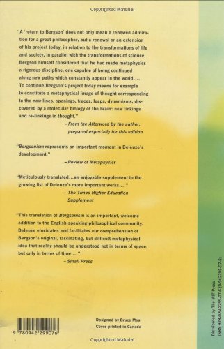 Bergson's writings incorporate three primary concepts: duration, memory, and elan vital. In the book Bergonism, by author Giles Deleuze analyzes Bergson's essays in an attempt to draw connections to more modern philosophical debates and teachings. Originally published more than thirty years ago, Bergsonism has been translated into English by Barbara Habberjam. Since its initial printing in November of 1990, this book has become a classic, and has been a trusted companion for anyone pursuing the study of philosophy. Our understanding of duration as it relates to the way we think about time and space is one of the major concepts behind Bergson's theoretical principles. Deleuze's own work has been heavily influenced by the teachings of Bergson.