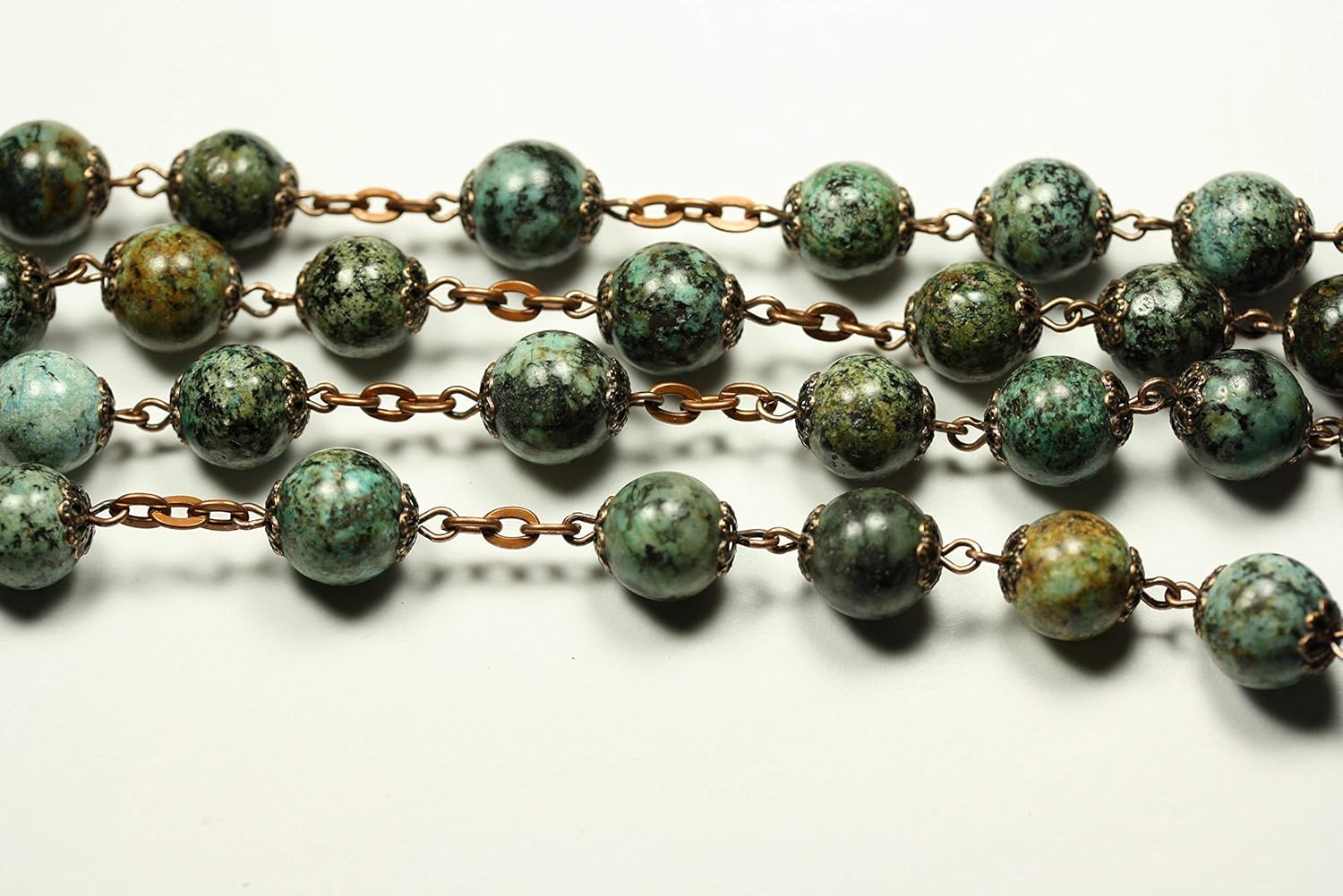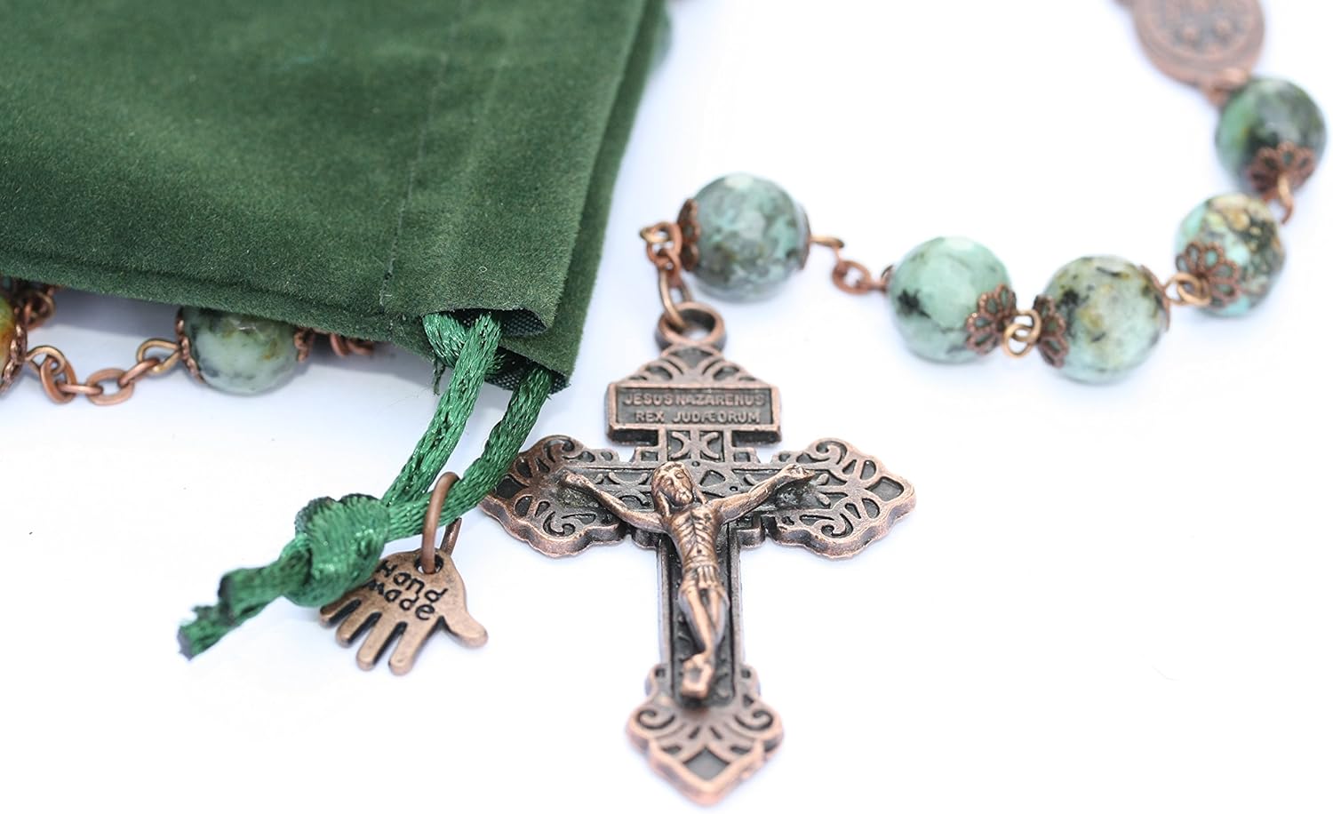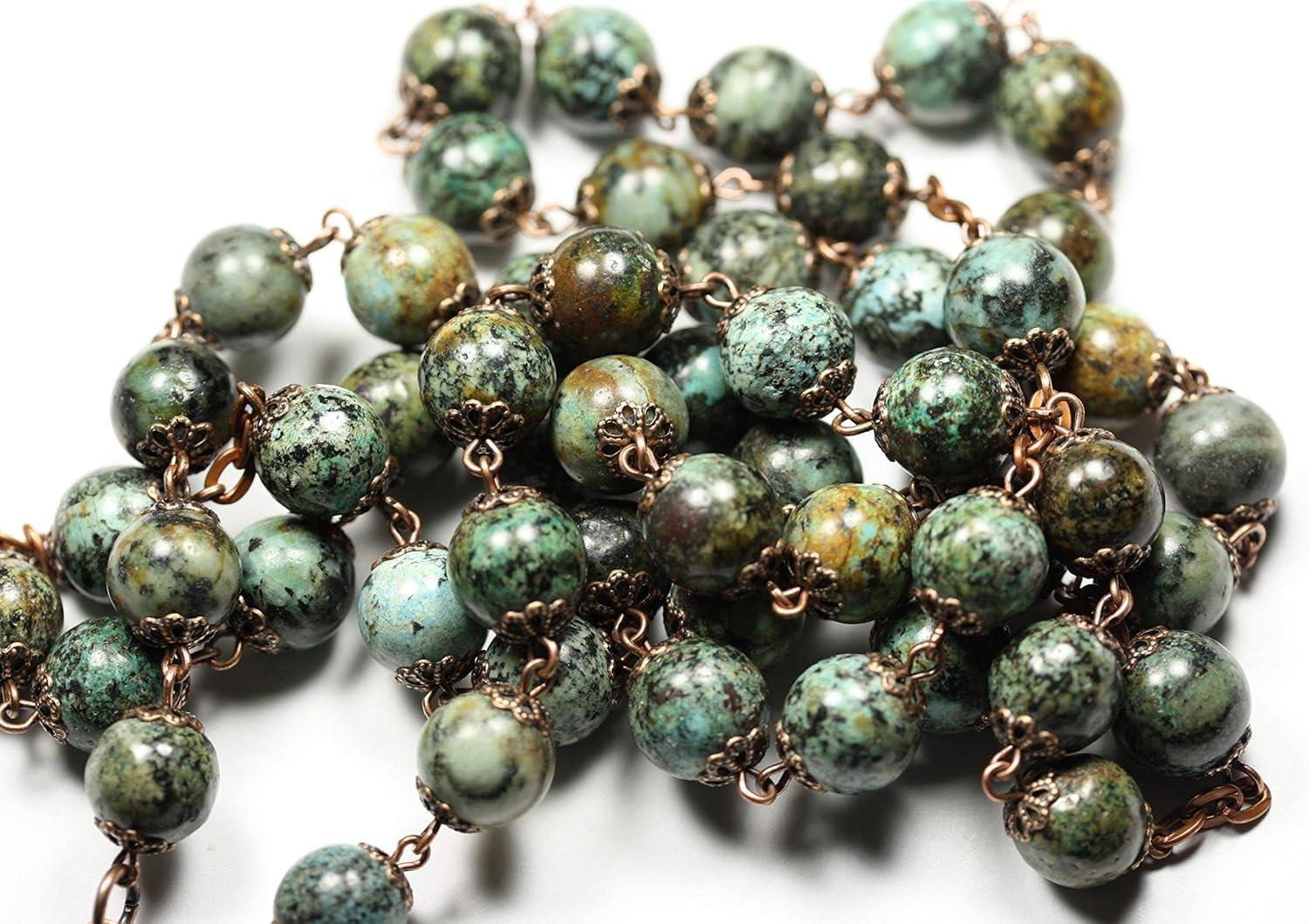 A great gift idea for Easter, First Holy Communion, Baptism, or special occasion. The Rosary is a visual reminder that we have been graced with salvation. This particular rosary from Oklahoma Rosaries has extra large sized beads which is especially helpful for elderly people/arthritic hands or people with low vision. Made from natural stone/semi precious beads featuring African Turquoise (jasper which is mined in Africa) accented by copper. The stone is extremely hard and will not be fragile, it can be used or worn everyday. This rosary is stunning and high quality, the cross is over two inches long and the rosary features a miraculous medal.