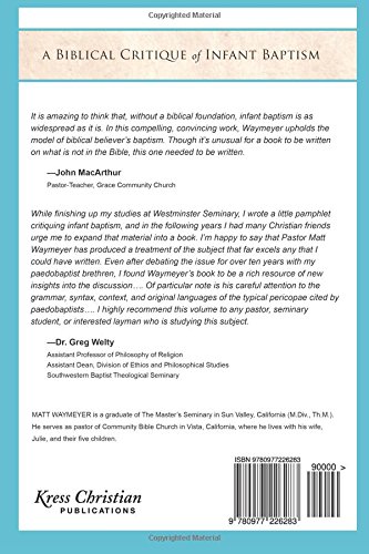 Should infants be baptized into any type of organized religion? Is it appropriate, or fair to the child? Does it force the infant to accept the faith and beliefs of a religion, while refusing them the right to choose that faith? The book A Biblical Critique of Infant Baptism, by author Matt Waymeyer, explores the arguments both for, and against the baptism of infants, and offers an fair and impartial critique of those practices throughout history. The book does, however, reach the determination that the baptism of infants in neither calle for, nor condoned by scripture. The book was published on February 8, 2008.