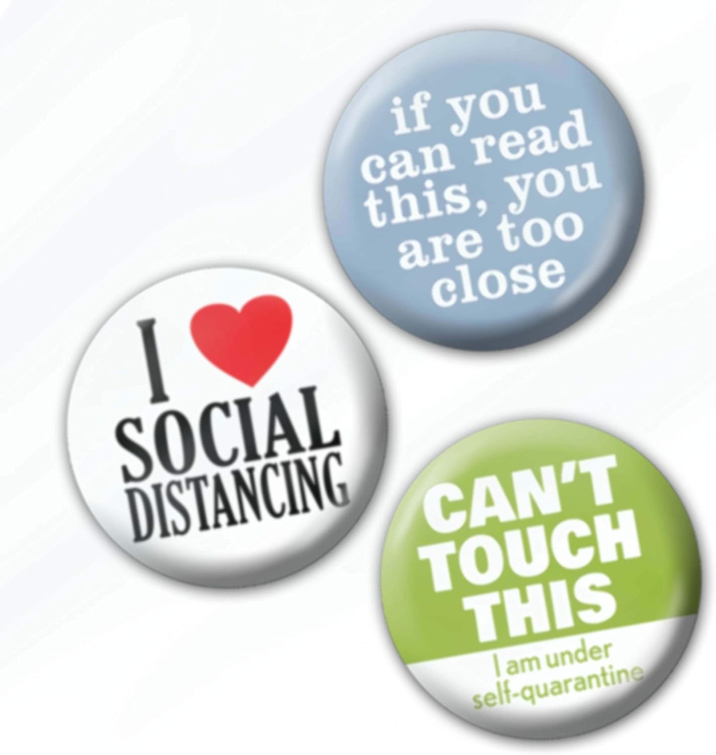 Every now and then life can use a little humor. The biggest social problem of our time, the coronavirus, has changed life, if not forever then for the foreseeable future. We deserve a chuckle! With this hilarious 3 pack of buttons you will get a smile from everyone! You can even order the buttons in 4 sizes. Three statements: You Can't Touch This - I am under self-quarantine; If You Can Read This You Are Too Close; and I Love Social Distancing (for the introvert in all of us). Spread the love (from an appropriate distance) at the office or this is a great gift idea for kids as well!