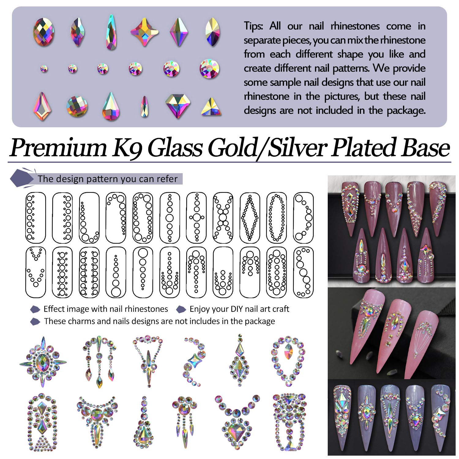 - Quality: Made from high quality K9 Glass which is pure, solid and transparent. Via special steam treatment, the AB coating is bonded firmly to the outer surface of each crystal bead. Crystal ab, iridescent, aurora borealis. Beads with AB coating act like a mirror while reflecting a rainbow of colors. Silver plating helps to enhance reflective dazzling. Built-in flat backs can be easily applied to natural and artificial nails.