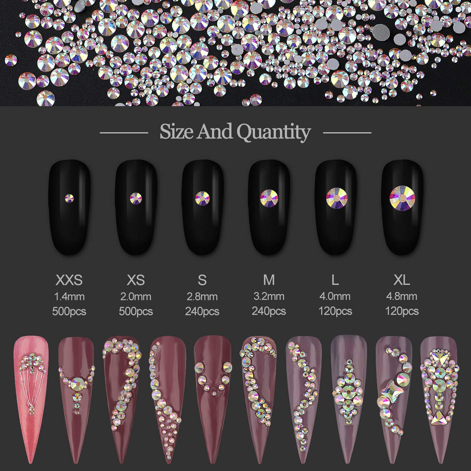 - Multi-sized: Total 1840pcs Super Sparkle Clear Rhinestones Nail Crystals for Crafts. Includes 1720pcs round ab rhinestones, Round ab rhinestones have six sizes, XXS(1.4mm, 500pcs), XS(2mm, 500pcs), S(2.8mm, 240pcs), M(3.0mm, 240pcs), L(4.0mm, 120pcs), XL(5.0mm, 120pcs). The mixture of different sizes makes it easier to achieve different designs of nail art,which add sparkle and glamour to your crafts, make your nails more dazzling and charming.