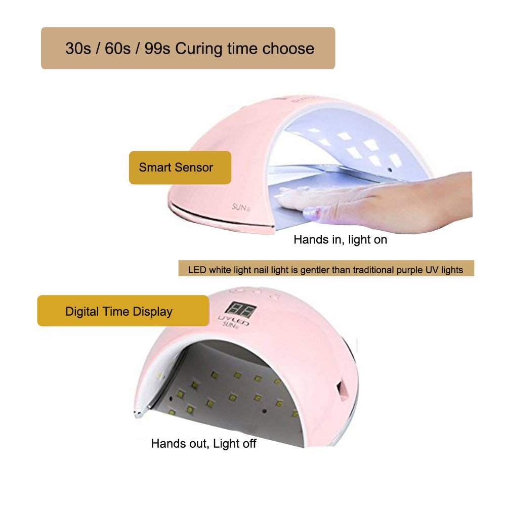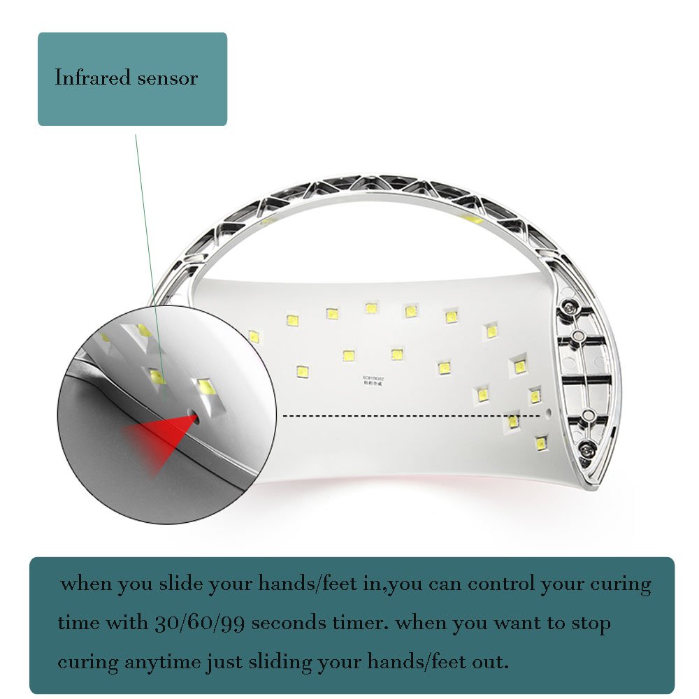• Professional Led nail lamp dryer, Durable LED beads dry nails for up to 50,000 hours, Fashion appearance and wide enough zone make it easier to cure 5 fingernails or toenails at the same time. it comes on automatically for 99 seconds, hands in,light on, hands on,light off.
