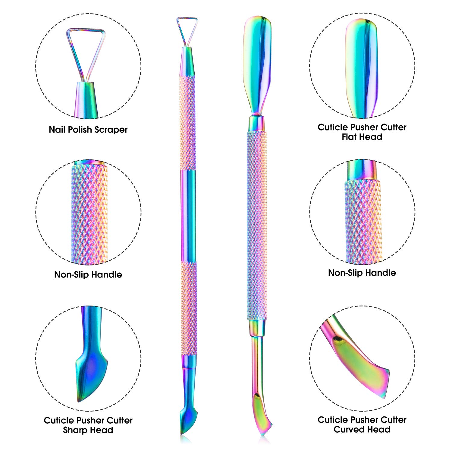 • QUALITY AND STYLE: These manicure tools are made from high-quality stainless steel to ensure durability and reliability. The rust-resistant nail tools will maintain their quality for a long time so that you can have a safe and precise experience every time. The chameleon finger nails trimmer and scrapper tool have a colorful outlook that makes it unique among all others. No more dull looking equipment to your manicure and pedicure treatment.