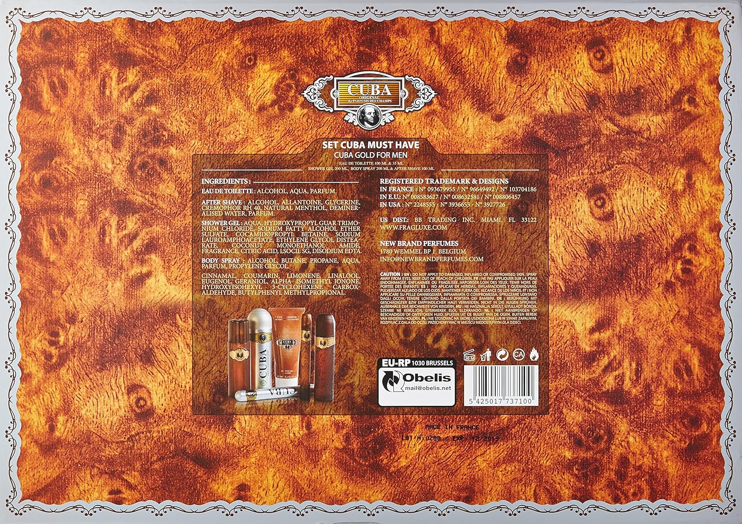 Cuba Gold for Men Gift Set (Eau de Toilette Spray 3.3 Ounce, Eau de Toilette Spray 1.17 Ounce, After Shave, Deodorant Spray, Shower Gel)