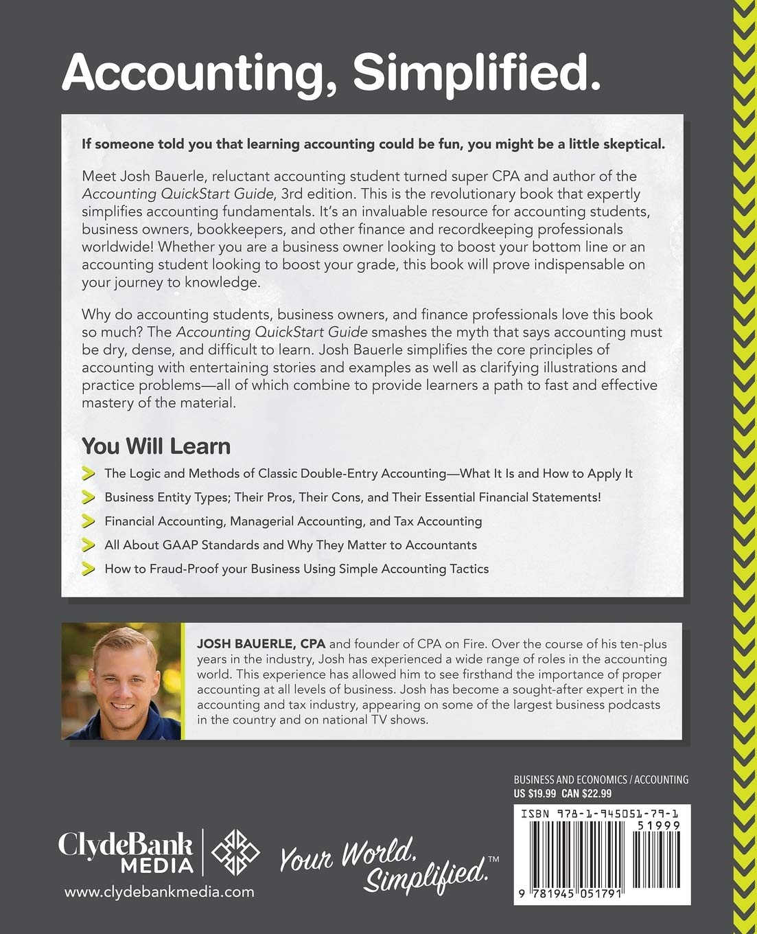 Why do accounting students, business owners, and finance professionals love this book so much? The Accounting QuickStart Guide smashes the myth that says accounting must be dry, dense, and difficult to learn. Josh Bauerle simplifies the core principles of accounting with entertaining stories and examples as well as clarifying illustrations and practice problems—all of which combine to provide learners a path to fast and effective mastery of the material.
