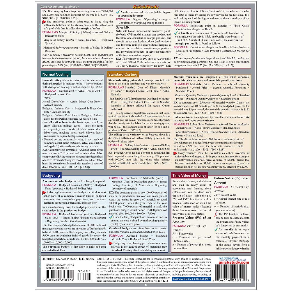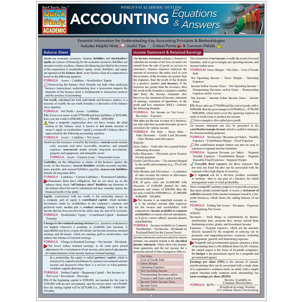Whether you are a business or accounting student looking to ace the next test or a veteran of the business world who could use a refresher, the Accounting Equations & Answers QuickStudy® guide is here to help! This three-panel guide outlines commonly used and difficult-to-remember accounting equations for tracking assets, liabilities, equity, income, and more, as well as handy hints, common pitfalls, and other points to make sure you don’t let anything slip through the cracks. Examples are included for easy comprehension.