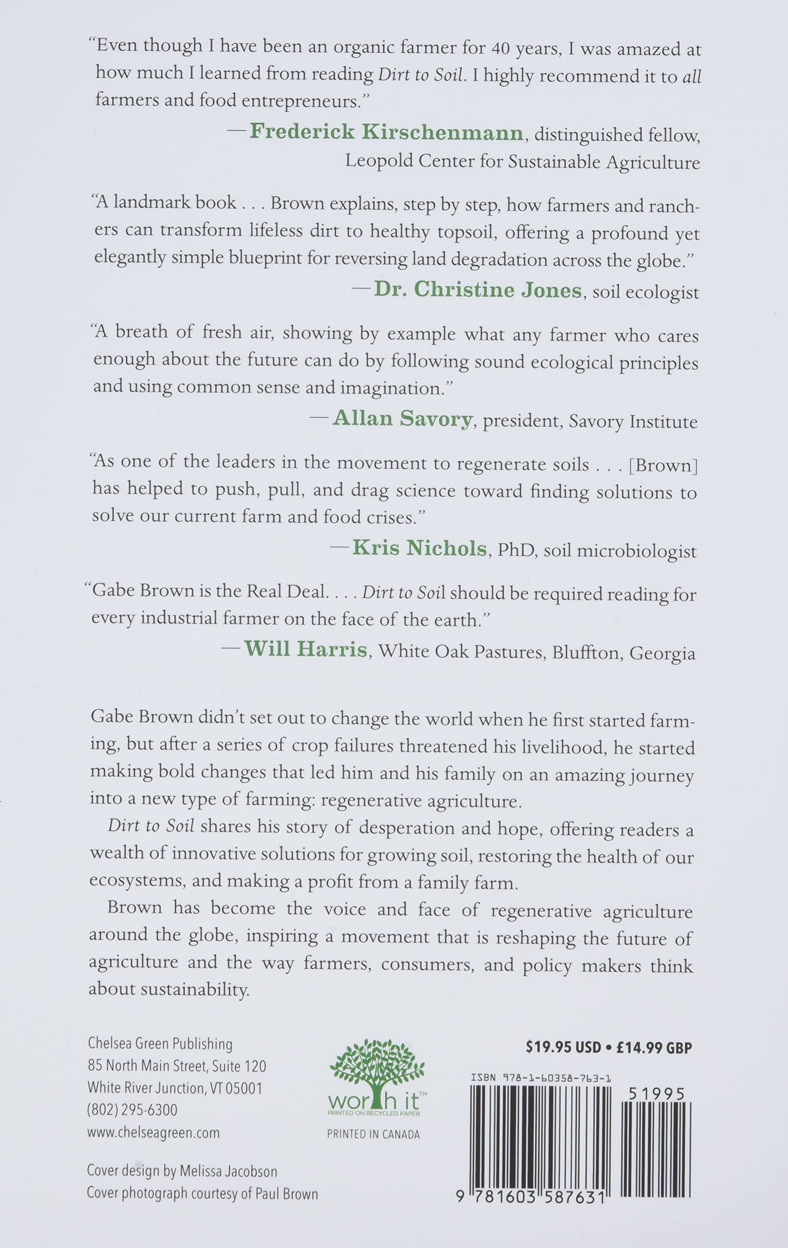 In Dirt to Soil Gabe Brown tells the story of that amazing journey and offers a wealth of innovative solutions to restoring the soil by laying out and explaining his "five principles of soil health," which are: