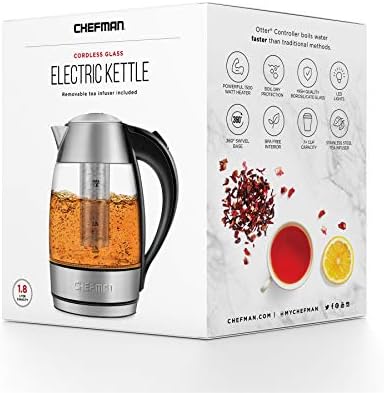 Chefman Electric Glass Kettle, Fast Boiling W/ LED Lights, Auto Shutoff & Boil Dry Protection, Cordless Pouring, BPA Free, Removable Tea Infuser, 1.8 Liters