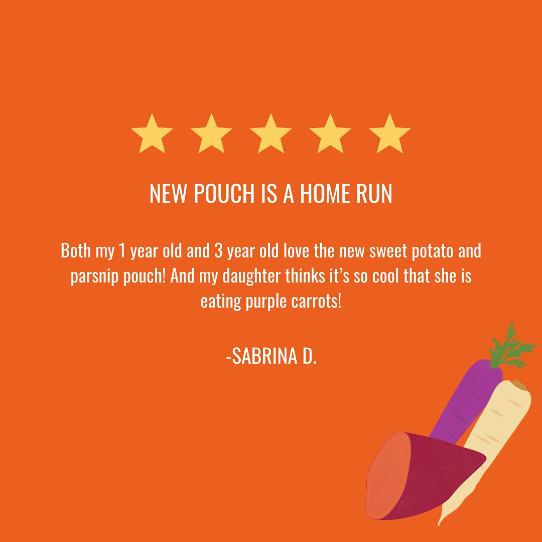 - ORGANIC SWEET POTATO & PARSNIP • Contains 6 pouches of baby food purees made from organic sweet potatoes, carrots, and parsnip, plus healthy fats from olive oil.