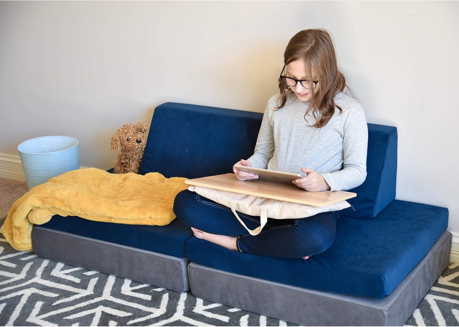 - 6 PIECE DESIGN: This two-toned sofa features 6 pieces: 2 navy back rests, 2 gray bottom pieces and 2 navy top pieces. The bottom pieces feature sturdy, dense foam to ensure the sofa will endure a lot of wear and tear. The top pieces have a less dense, softer foam to entice kids, teens and young adults to snuggle into their new couch. The back rests are each 20"L x 9.75"W at the bottom and 3.5"W at the top x 11"H. Bottom pieces each measure 25"L x 28"W x 5"H. Top cushions each measure 25"L x 28"W x 3"H.