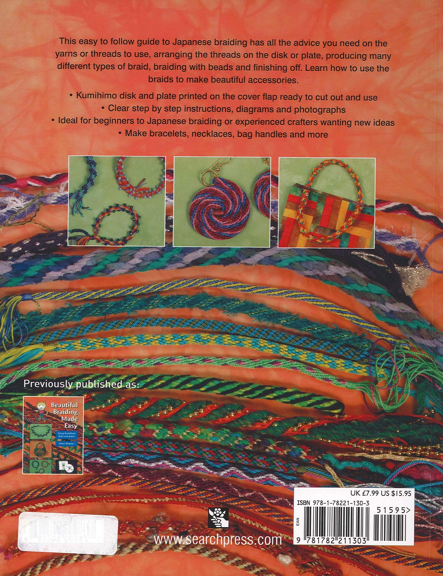 Search Press Beautiful Braiding Made Easy Book- An easy to follow guide to producing beautiful Japanese braids using Kumihimo disks and plates; templates for which are printed on the cover flap ready to be cut out and used. There is advice on the yarns or threads to use, arranging the threads on the disk or plate, producing many different types of braid, braiding with beads, finishing off and using the braids to make bracelets, necklaces, bag handles and much more. 48 pages, soft cover.