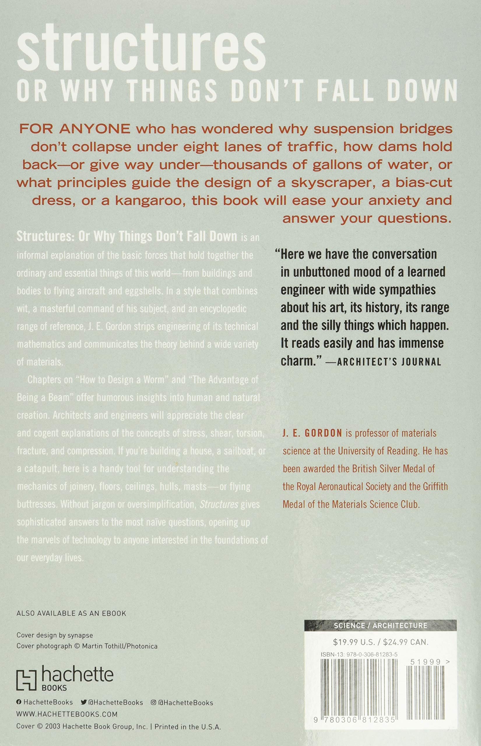 Structures: Or Why Things Don"t Fall Down is an informal explanation of the basic forces that hold together the ordinary and essential things of this world--from buildings and bodies to flying aircraft and eggshells. In a style that combines wit, a masterful command of his subject, and an encyclopedic range of reference, Gordon includes such chapters as "How to Design a Worm" and "The Advantage of Being a Beam," offering humorous insights in human and natural creation.