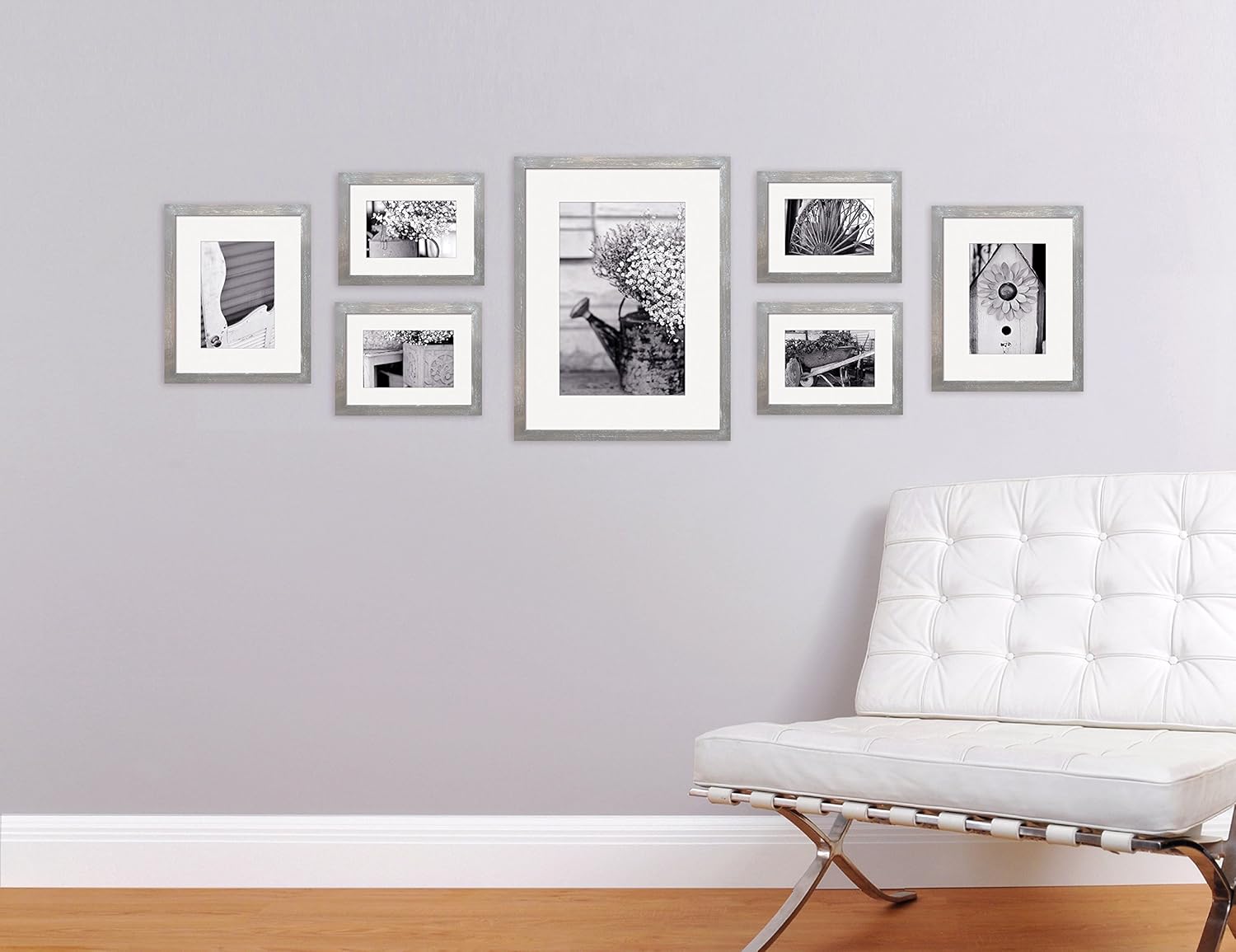 - Seven grey decorative frames with removable contrasting white mats. Frame finishes available in: Black/Walnut/White