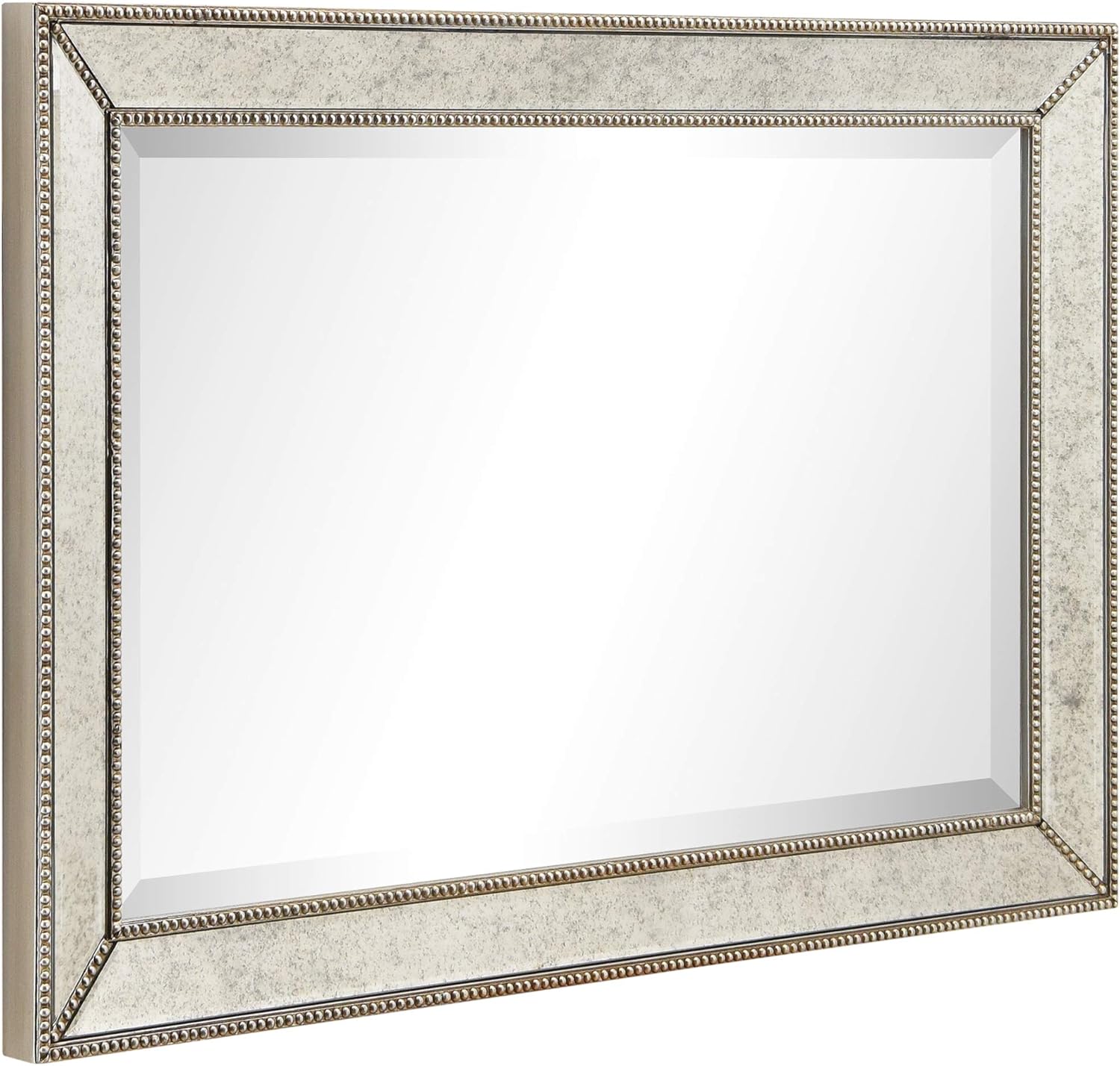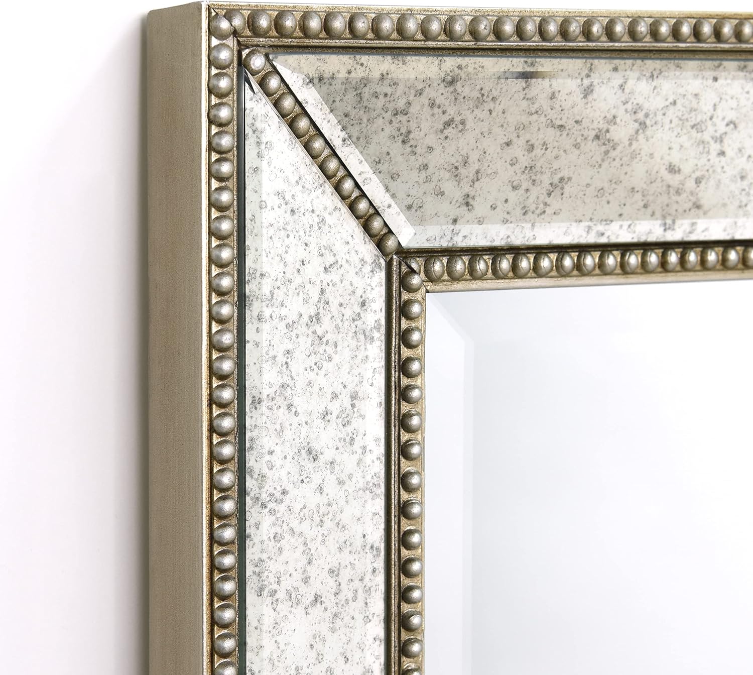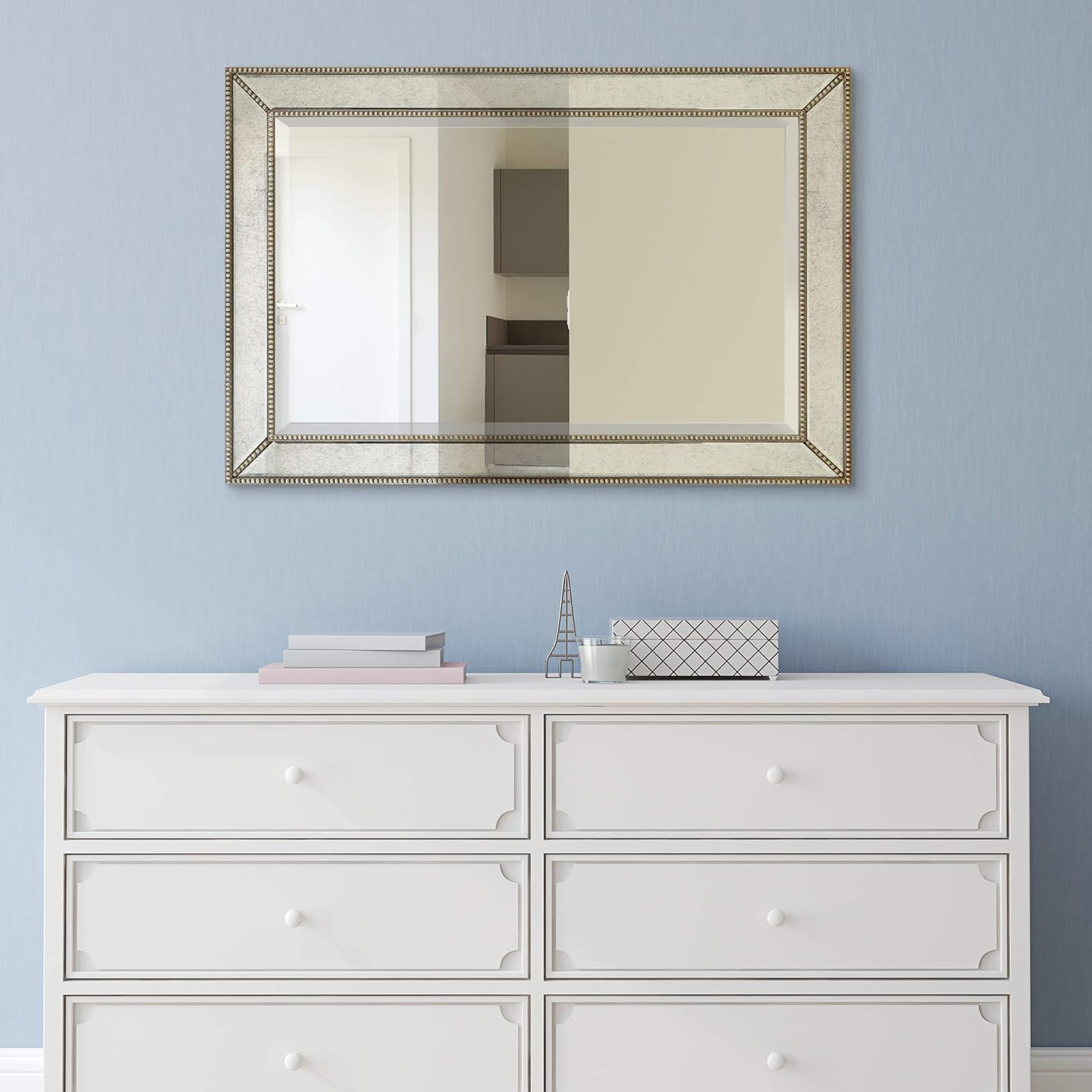 - UNIQUE MIRROR - This wall mirror is raised slightly from its surrounds by a 1-inch bevel that helps the mirror to project a presence into the room, while also providing a space for adornment. The mirror has a silver pattern with bronze beads that recalls a royal style.