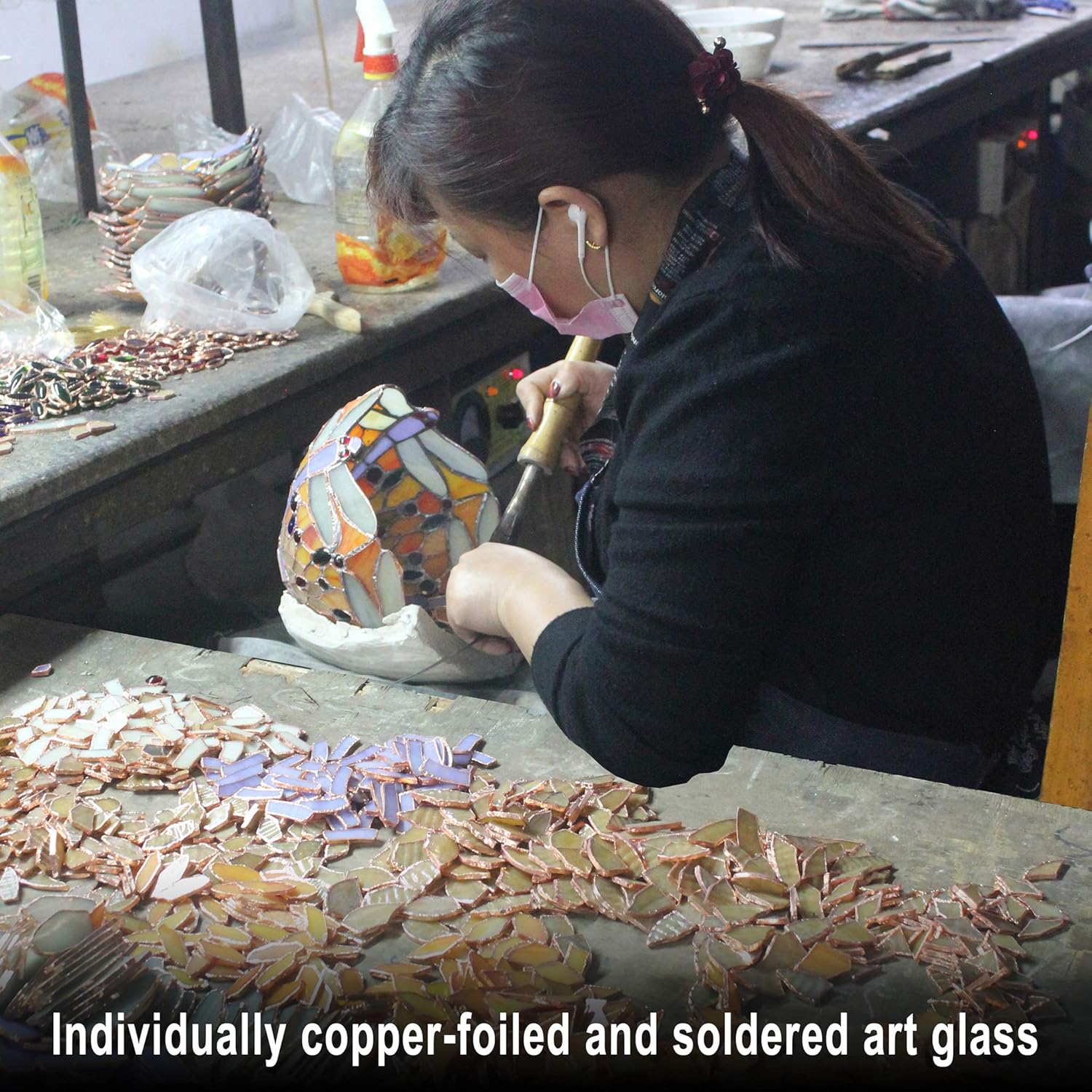 - HIGH-QUALITY WINDOW TREATMENT - This is authentic, hand-crafted artist stained glass; each of the over 300 pieces of high-quality hand-cut art glass and 11 cabachon stained glass gems is wrapped in copper foil, and individually soldered, taking our artisans many hours to craft each by hand.
