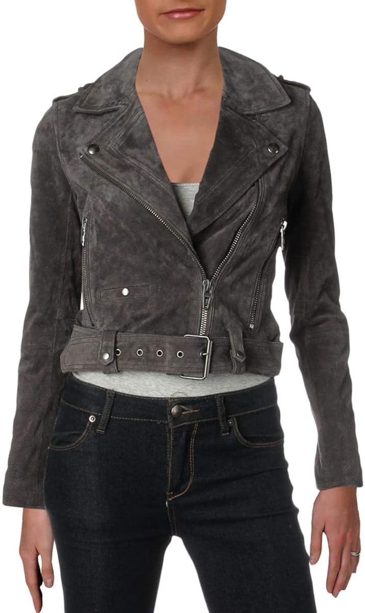 - PREMIUM QUALITY: Biker jackets are made from premium suede leather with real functional pockets, adjustable belted hem and snap-tab belt loops. The material is lightweight and provides a semi fitted, yet comfortable, cropped wear throughout the day. Asymmetrical front zipipper with metal hardware & zip sleeve detail