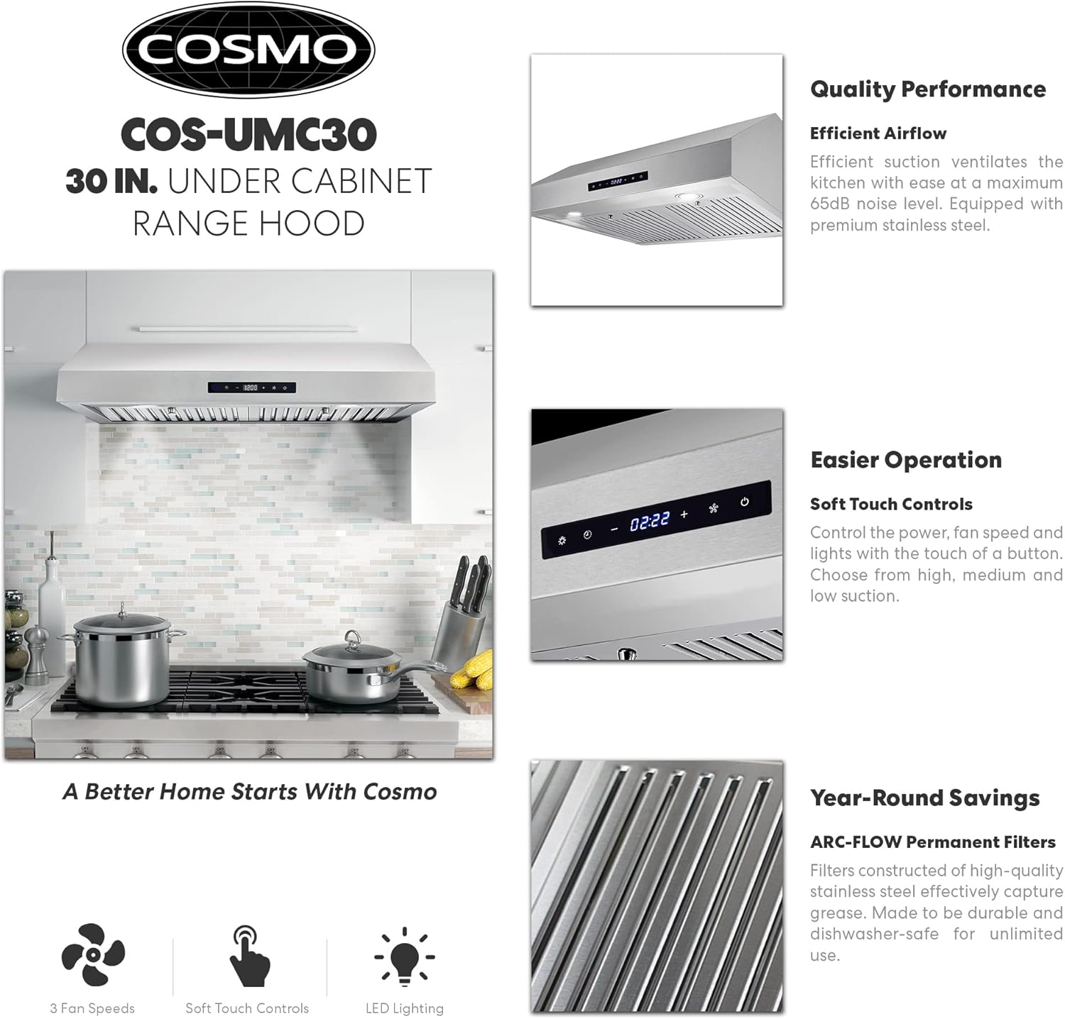 Cosmo UMC30 Under Cabinet Stainless Steel Range Hood with 380 CFM, Permanent Filters & LED Lights, 30 inch