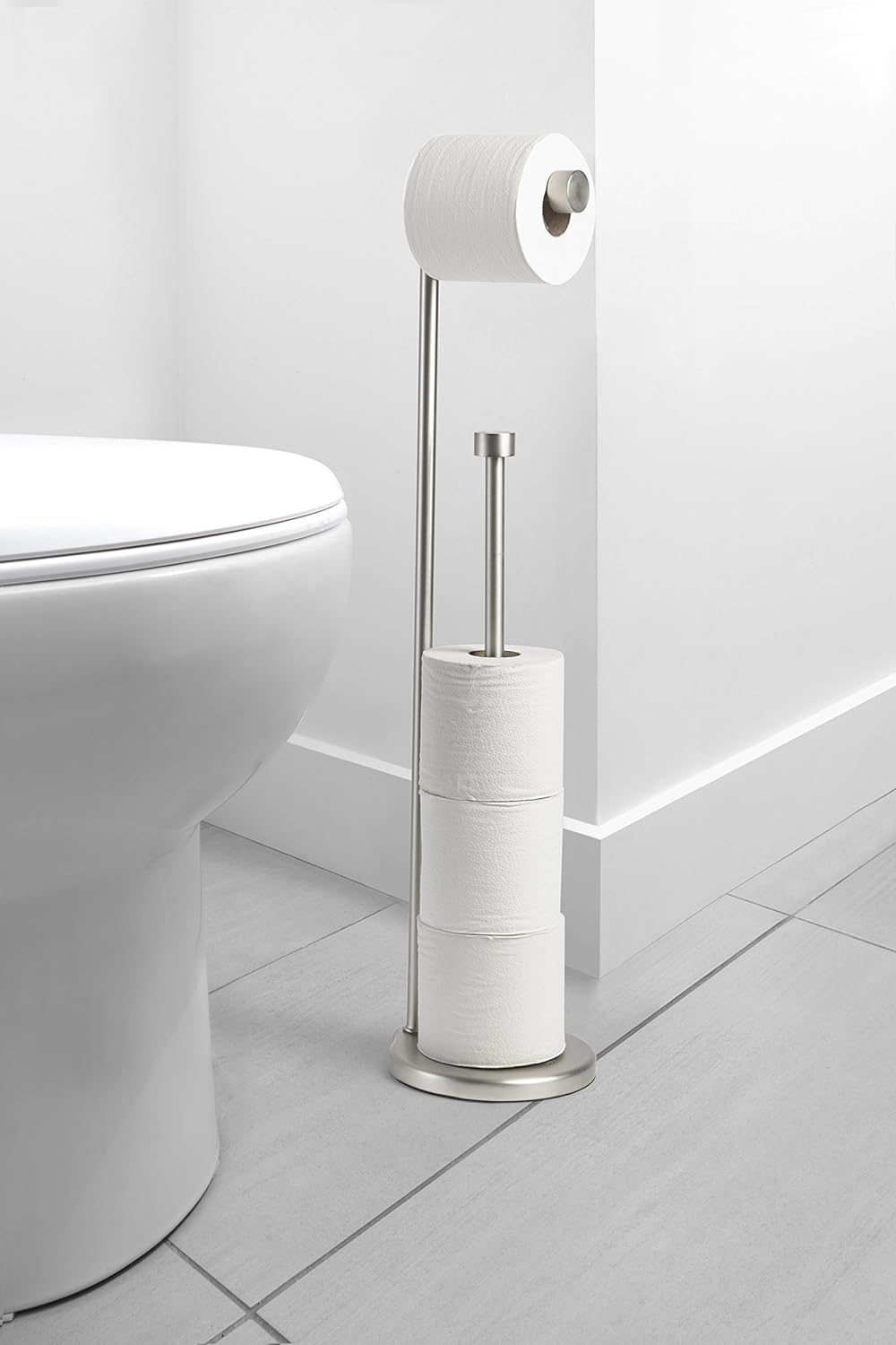 Amazon Basics Free Standing Bathroom Toilet Paper Holder Stand with Reserve, Silver Nickel