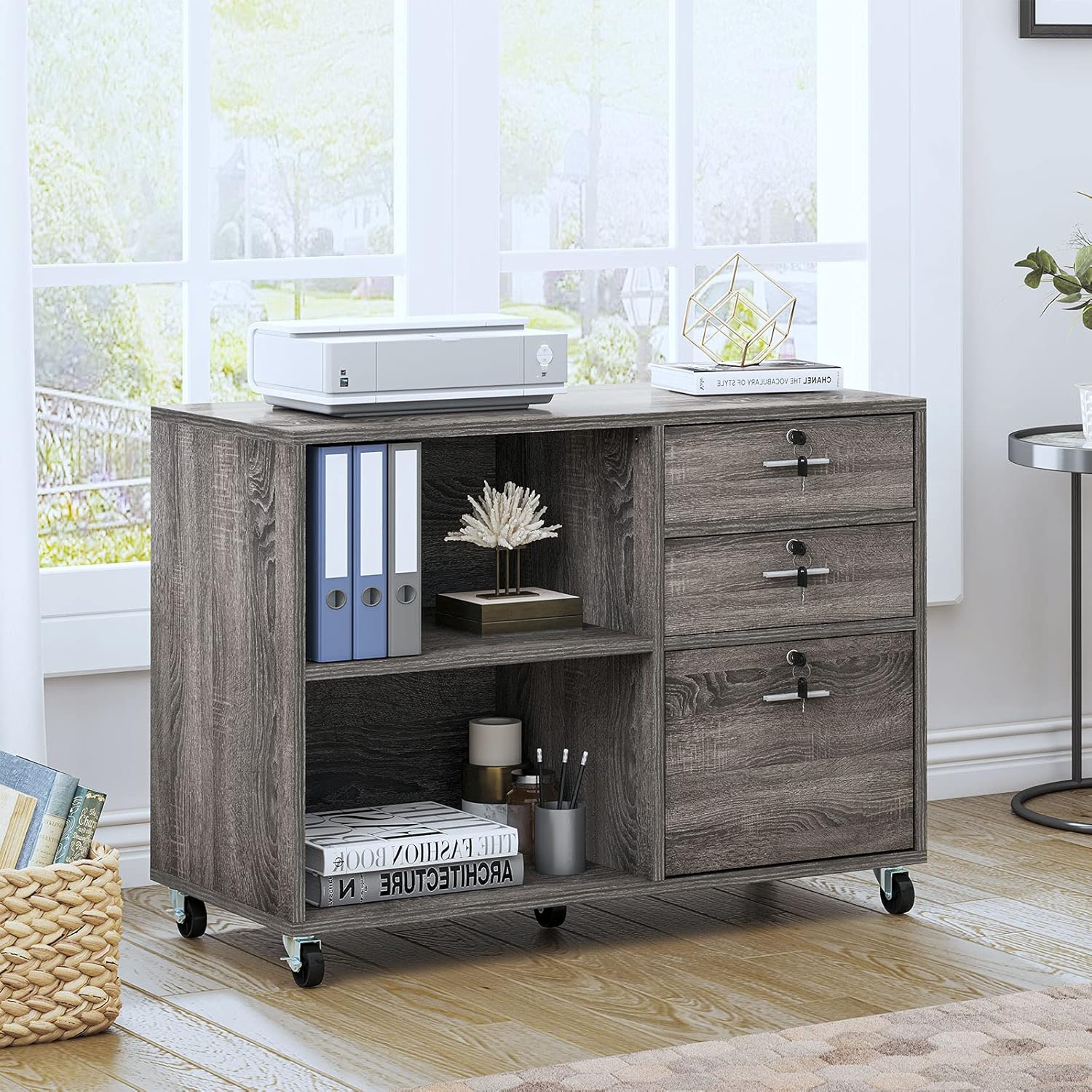 YITAHOME Wood File Cabinet, 3 Drawer Mobile Lateral Filing Cabinet, Storage Cabinet Printer Stand with 2 Open Shelves for Home Office Organization,Grey