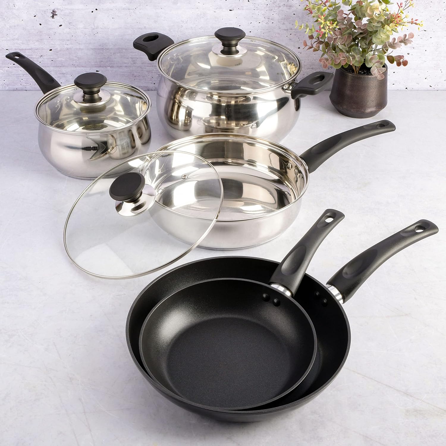 - 2.5-quart stainless steel saucepan with lid, 5-quart stainless steel Dutch oven with lid, stainless steel 3.5-quart saute pan with lid, 8" nonstick frying pan, 10" nonstick frying pan
