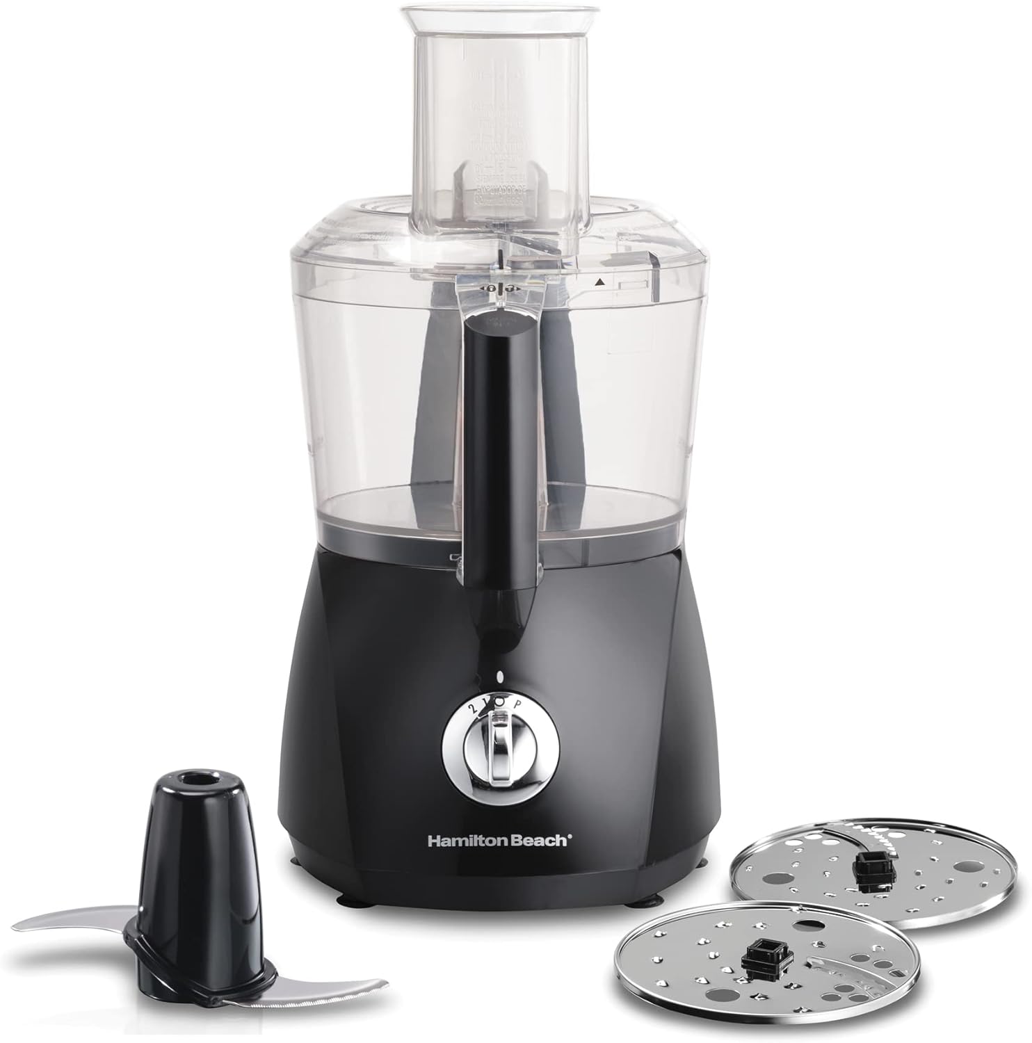 - 6 VERSATILE PROCESSING FUNCTIONS WITH 3 ATTACHMENTS. The Hamilton Beach 10 Cup Food Processor has 6 processing functions so you can chop, puree, slice, shred finely, shred coarsely and crinkle cut with ease.