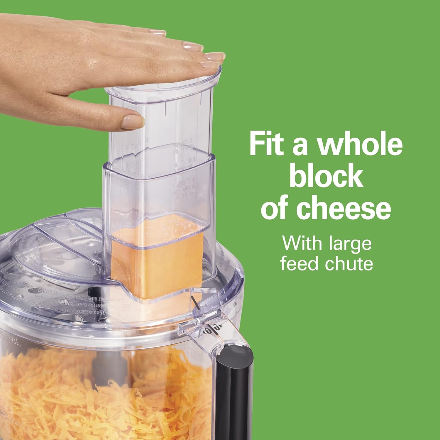 - FIT A WHOLE BLOCK OF CHEESE WITH LARGE FEED CHUTE. You"ll save time and reduce the need for pre-cutting with the Hamilton Beach food processor because you can fit whole foods like a zucchini or block of cheese in the feed chute.