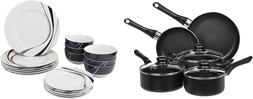 Amazon Basics 18-Piece Kitchen Dinnerware Set, Plates, Dishes, Bowls, Service for 6, Swirl & Non-Stick Cookware Set, Pots and Pans - 8-Piece Set