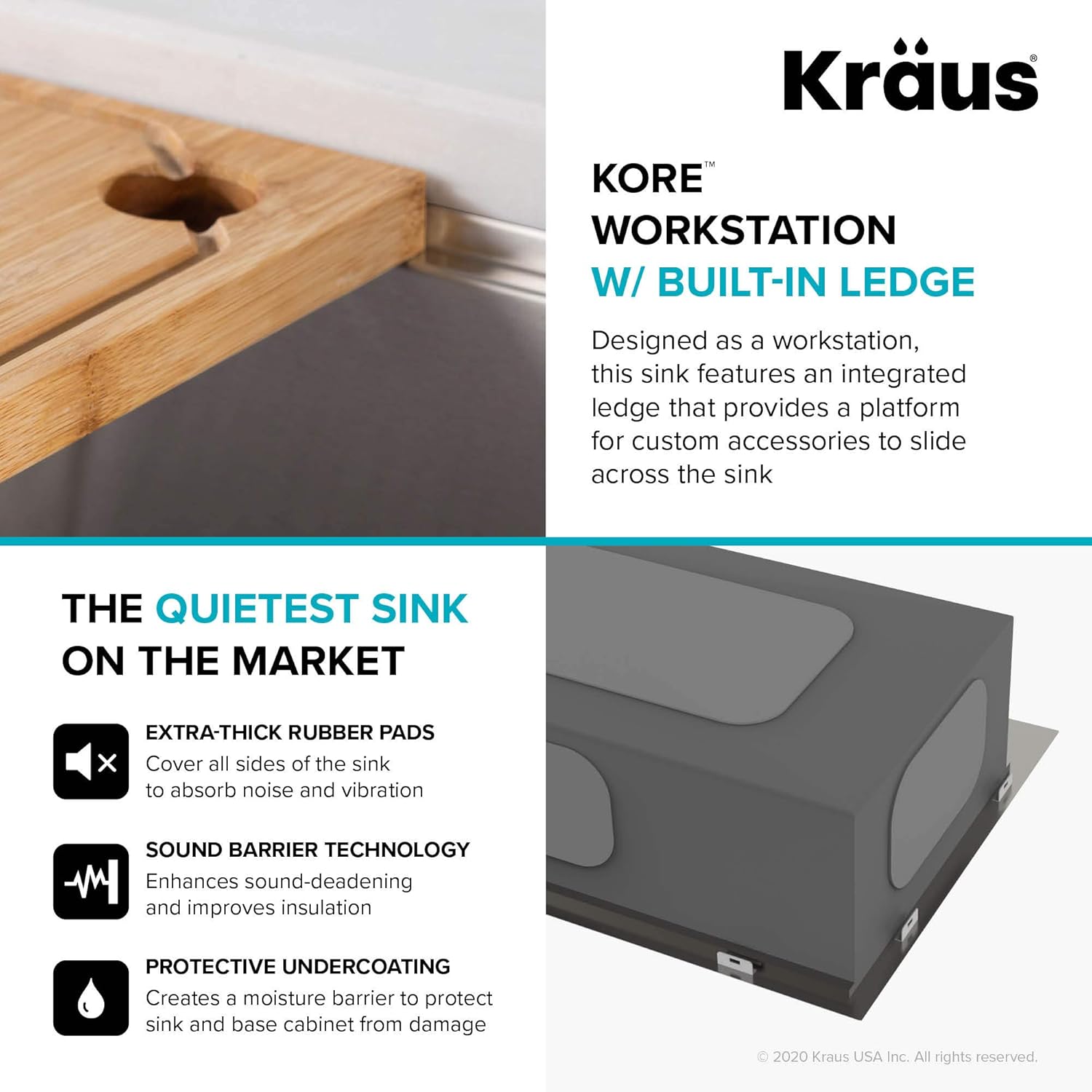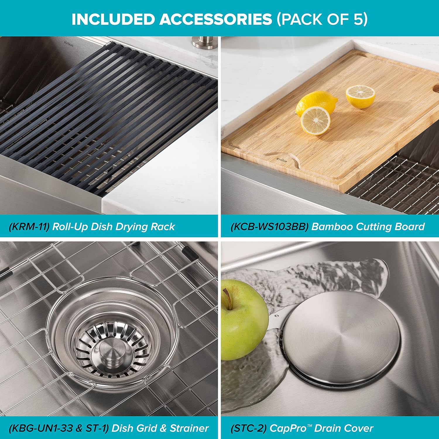 Kraus KWF210-33 Kore Workstation 16 Gauge Farmhouse Single Bowl Stainless Steel Kitchen Sink with Integrated Ledge and Accessories (Pack of 5), 33 Inch Rounded Apron Front