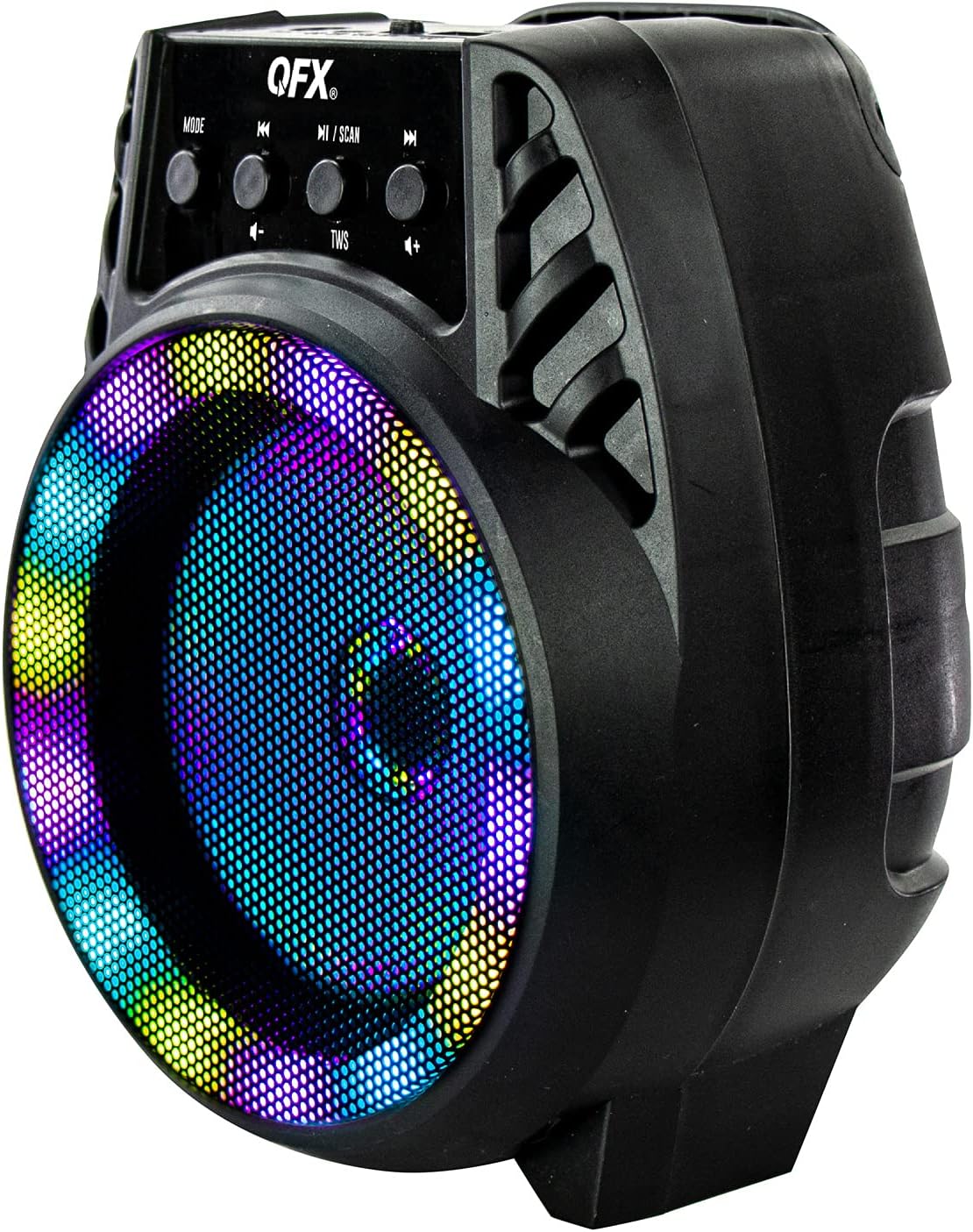 QFX BT-64 TWS Bluetooth Rechargeable Portable Speaker with 4” Woofer LED Party Lights, Microphone Input, AUX Input, USB Port, TF Card Slot, Black
